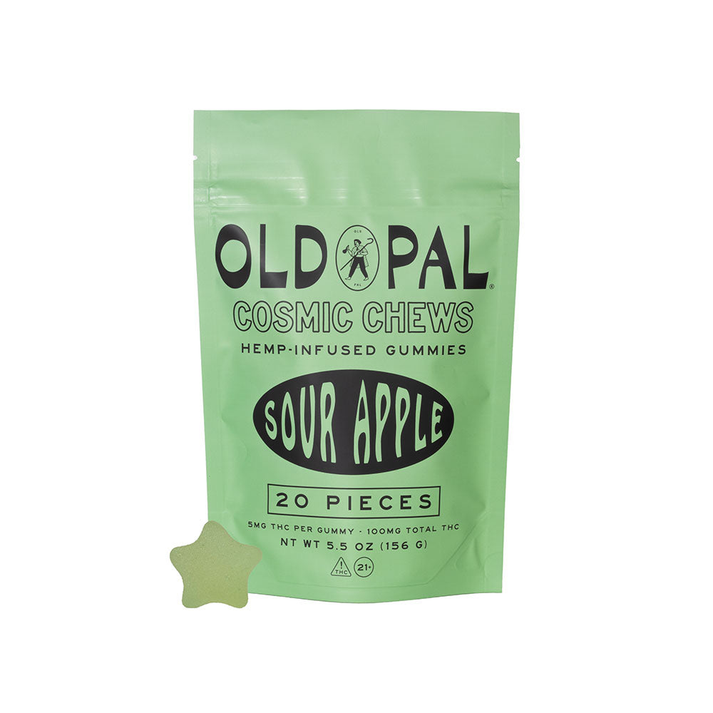 Old Pal Cosmic Chews are a trip down memory lane. These fruity gummies are a fresh take on a classic. A balance of refreshing and sweet, Sour Apple Cosmic Chews are sure to tantalize your taste buds and put some pep in your step. With 5mg of hemp-derived THC per individually wrapped piece, these chews are stackable for a customizable sesh.